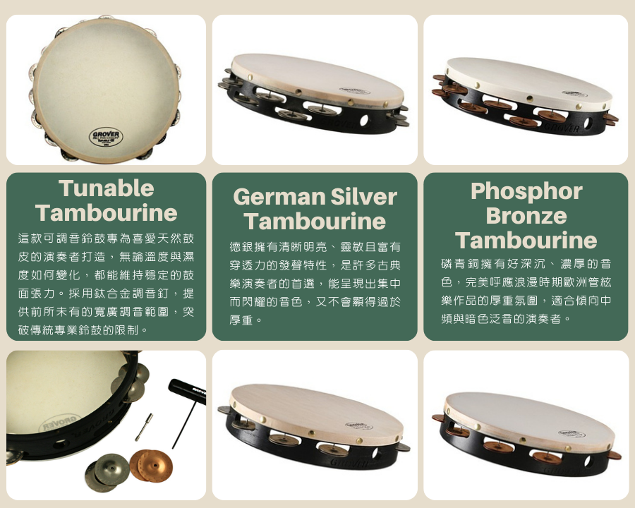 Grover Projection-Plus™系列專業型鈴鼓手工精鍊的鈴片音色宛如合唱般,有著豐厚的聲響,交錯配置的鈴片,製造360°勻稱的音響;提供各種合金鈴片規格=多種音色選項,雙寬鈴片插栓,讓鈴片發出悅耳的鳴響;鼓框設計椎形凹面,讓手感握起來更舒適,也更容易控制。
