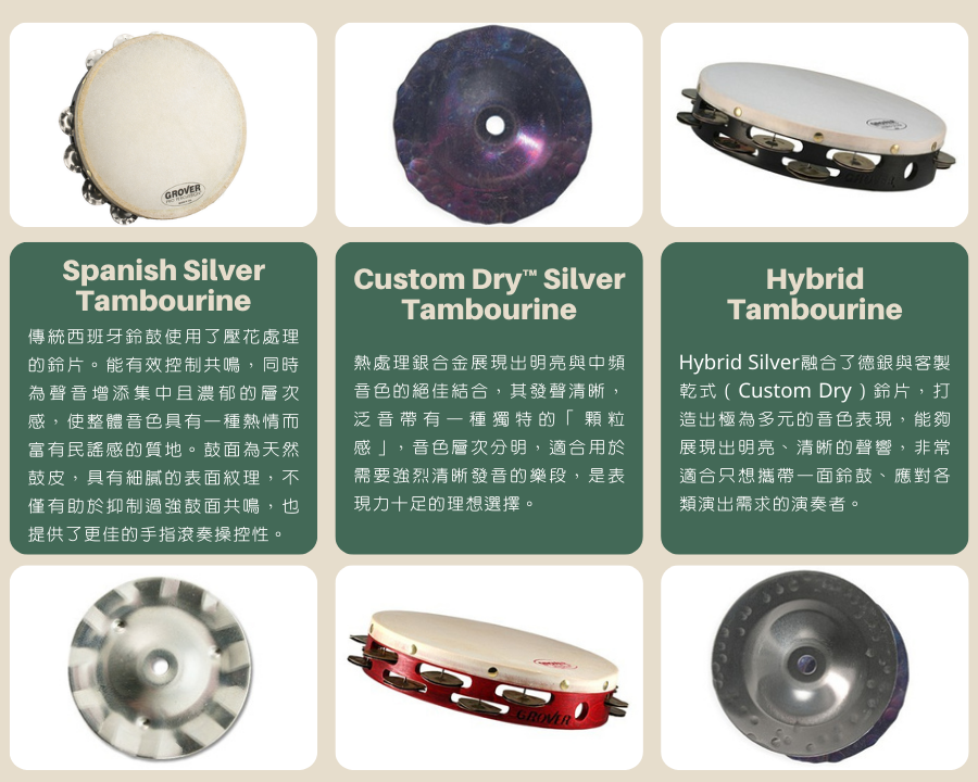 Grover Projection-Plus™系列專業型鈴鼓手工精鍊的鈴片音色宛如合唱般,有著豐厚的聲響,交錯配置的鈴片,製造360°勻稱的音響;提供各種合金鈴片規格=多種音色選項,雙寬鈴片插栓,讓鈴片發出悅耳的鳴響;鼓框設計椎形凹面,讓手感握起來更舒適,也更容易控制。
