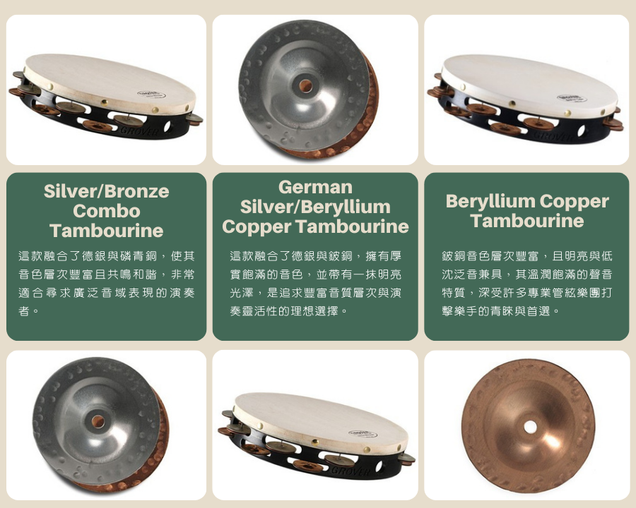 鈹銅鈴片為Grover Pro在1980年首創,此款稀有的合金是專門為想要明亮和深沉音色之間達到平衡的演奏家而創,深受許多專業管弦樂演奏者喜愛。