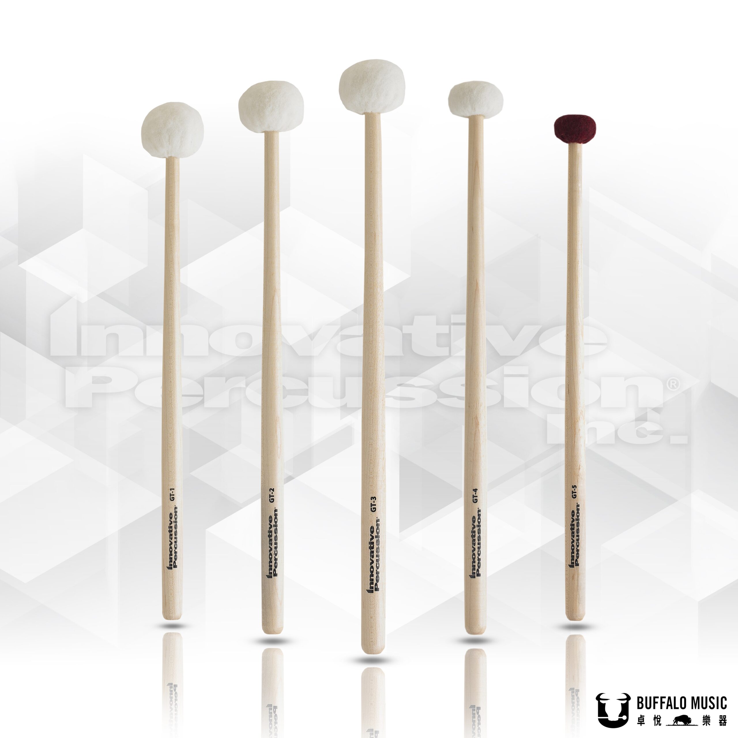 General Timpani系列採用錐形楓木柄達到完美的平衡,槌頭為德國毛氈材質,傘狀式覆蓋槌頭創造專業級音色,而GT-5型號的槌頭僅由紅色毛氈緊緊包裹著。