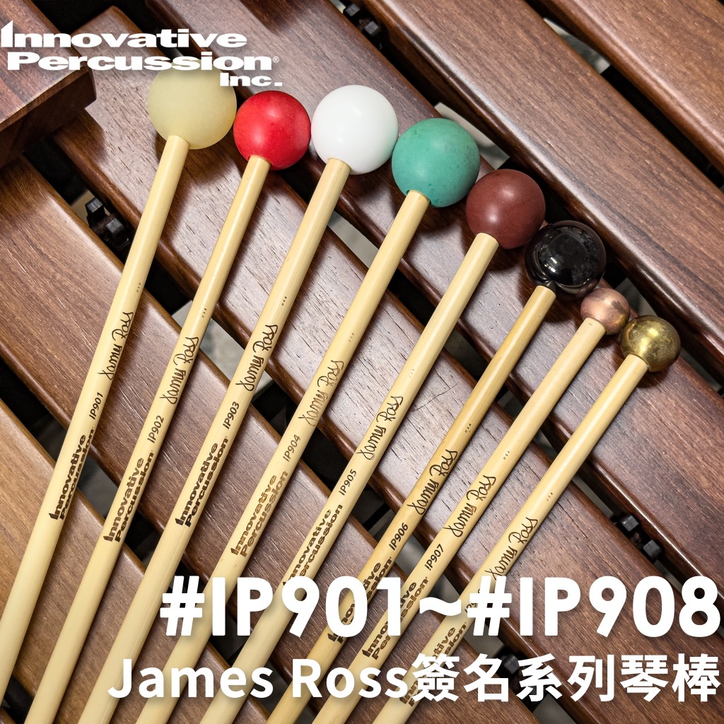 James Ross簽名系列裡面,除了IP907跟IP908銅頭型號很明顯是只能用於鐘琴(Glockenspiel/Bells)之外,其他的型號也可以使用在高音木琴上面,看似複雜的六個型號,簡單分類一下就可以發現,其實就是兩種尺寸的棒頭,一個尺寸裡面再細分出三種音色。