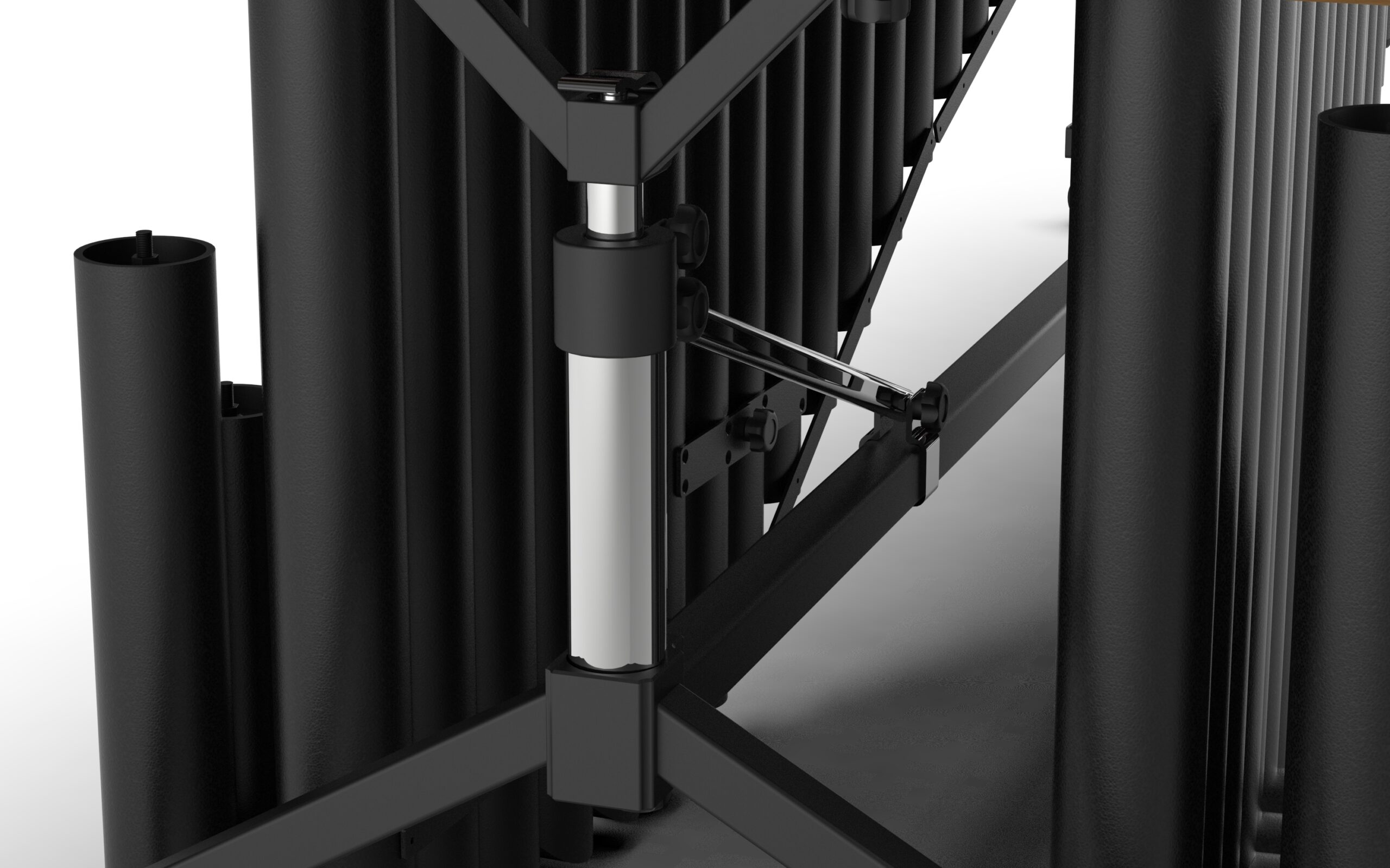 共鳴管結構採用的是對拆式設計,將鋁合金管子進行焊接與強化,再把共鳴管分成高音、中音與低音三組,僅需要使用螺絲將共鳴管進行組裝固定即可,大幅提升木琴在收納與搬運方面的機能性。